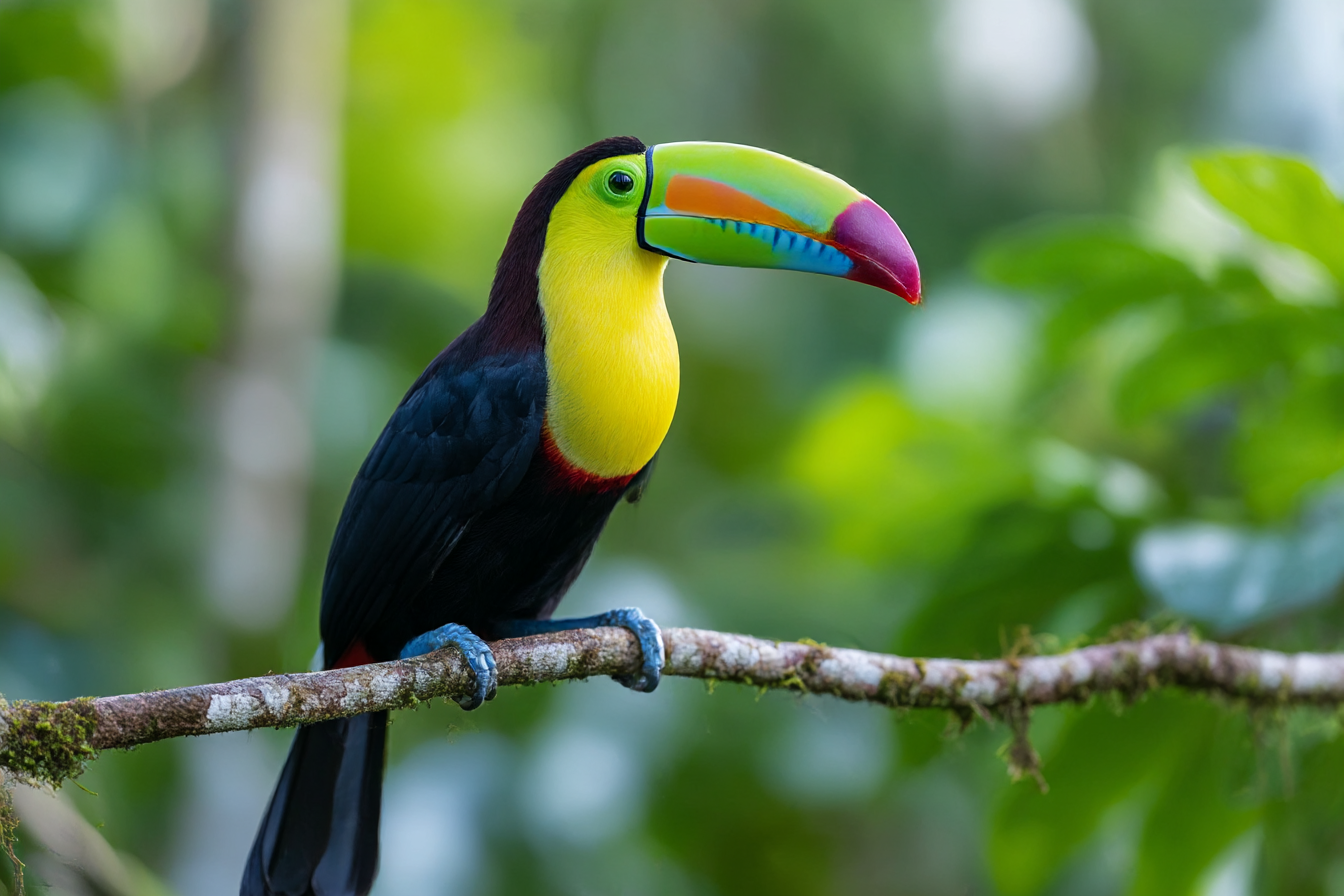 a vibrant keel-billed toucan perched on a rainforest branch, tropical morning light, cinematic wildlife photography, shallow depth of field, lush jungle background