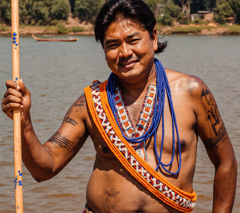 A golden-hour portrait of an elder of a panamian man wearing a blue and orange beaded sash around his chest, holding a wooden oar in one hand, standing on a boat near a river bank with trees behind him. he has tattoos, a round face shape, and short black hair, and is smiling at the camera.