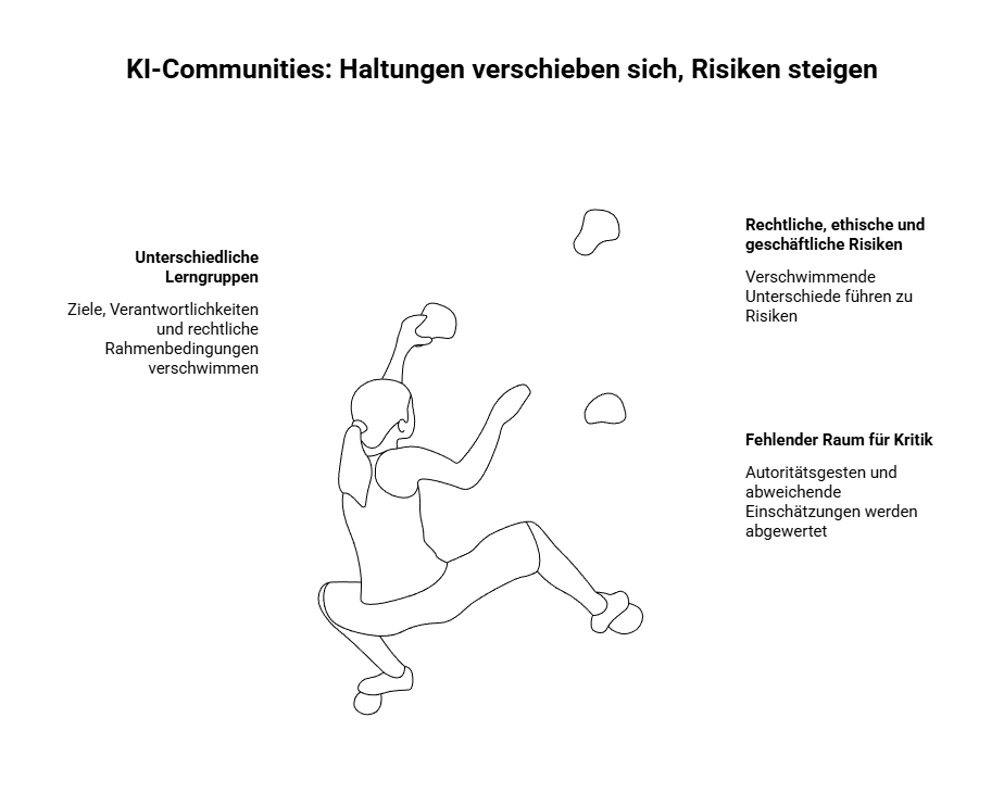 Hinzu kommt ein strukturelles Spannungsfeld: In vielen Communities treffen sehr unterschiedliche Lerngruppen aufeinander – pensionierte Privatpersonen, neugierig Interessierte, Angestellte, Einzelunternehmer sowie Führungskräfte aus Unternehmen. Diese Gruppen verfolgen unterschiedliche Ziele und unterliegen unterschiedlichen Verantwortlichkeiten und rechtlichen Rahmenbedingungen.