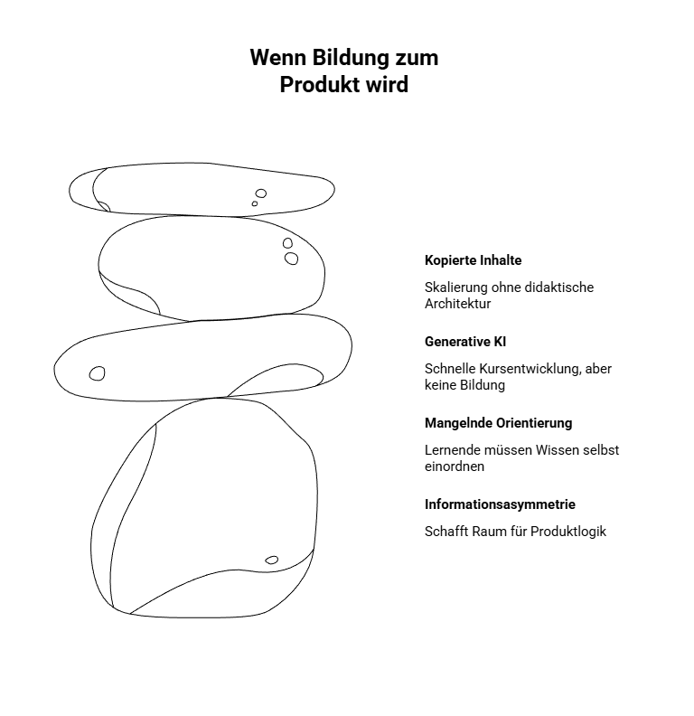 Der Einsatz von KI zur Unterstützung bei der Kurskonzeption ist legitim. Problematisch wird es dort, wo Inhalte lediglich kopiert, skaliert und nach immer gleichen Vorlagen produziert werden. In solchen Fällen entsteht zwar ein Produkt, aber keine Bildung.