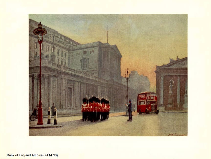 Quelle der Bilder und der spannenden History von: The Bank Picquet, Its function and history 1963, The frontispiece is from a painting in the Bank Collection, THE GUARD MARCHES FROM THE BANK, 1939, by the late H. S. Kortright, R.B.A., a member of the Staff, Bank of England Archive (7A147/3)