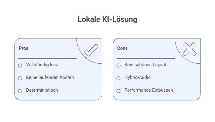 - Optionale Flexibilität: Lokal: Piper/Kokoro, kostenlos, aber mit Qualitätseinbussen im Ton. Cloud: ElevenLabs/Azure, nur bei Bedarf, weil Sicherheit an erster Stelle steht.