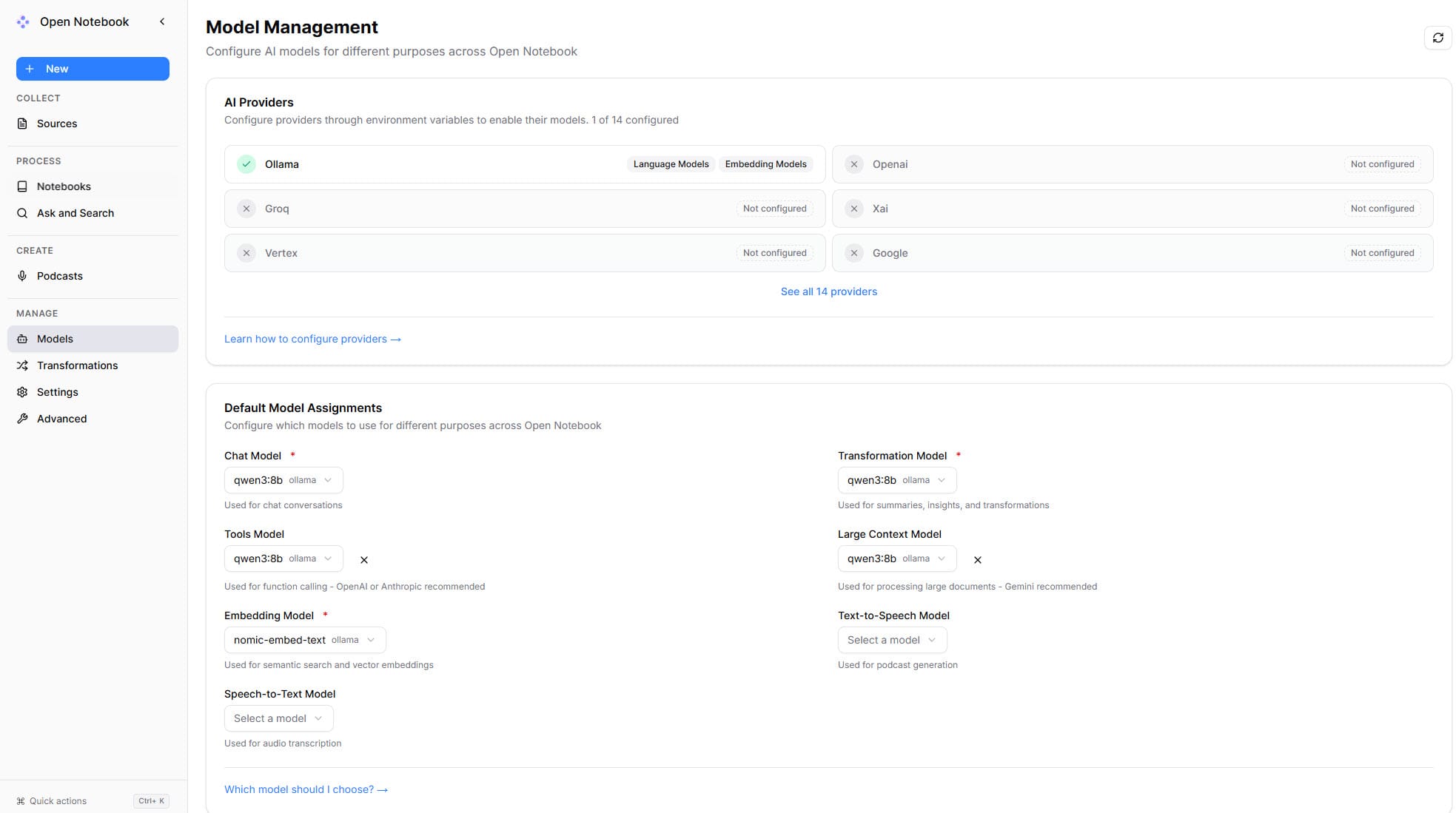 Nach dem Start wählte ich auf der Dashboardoberfläche in Open Notebook: "Welches KI-Modell soll es nutzen?"